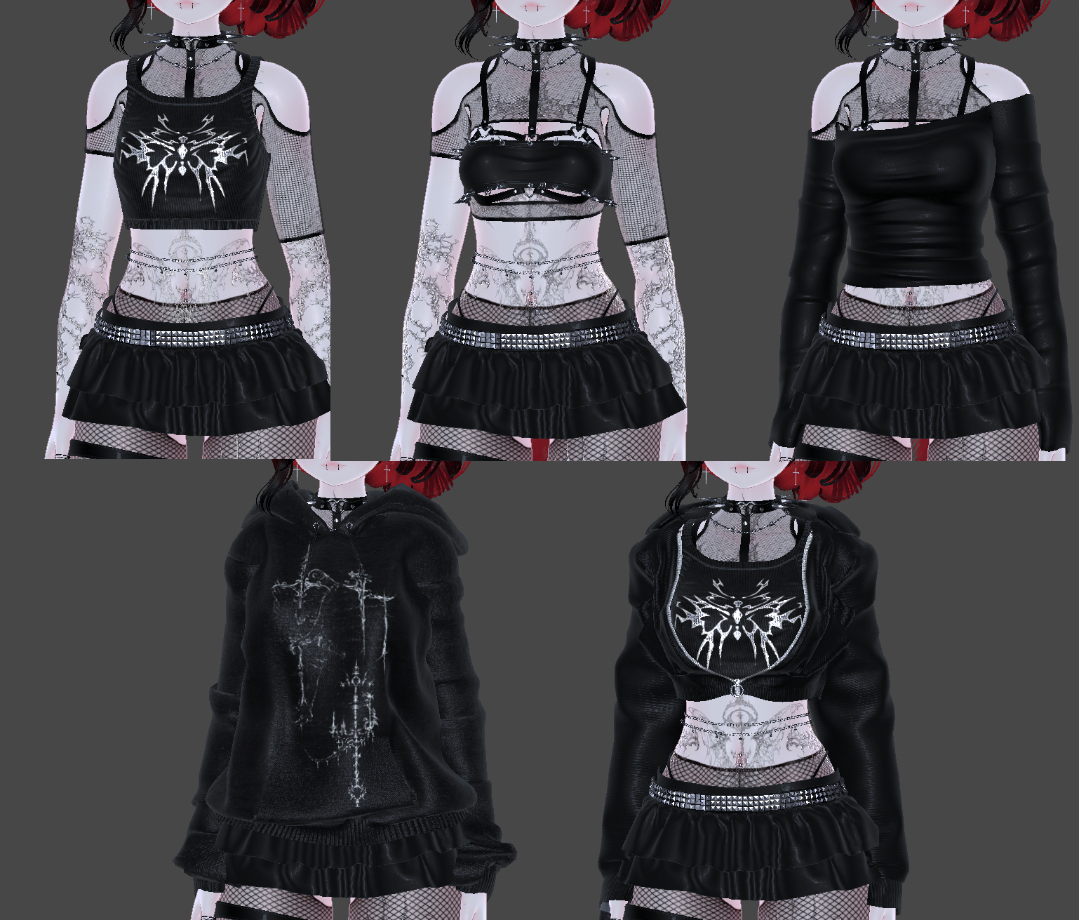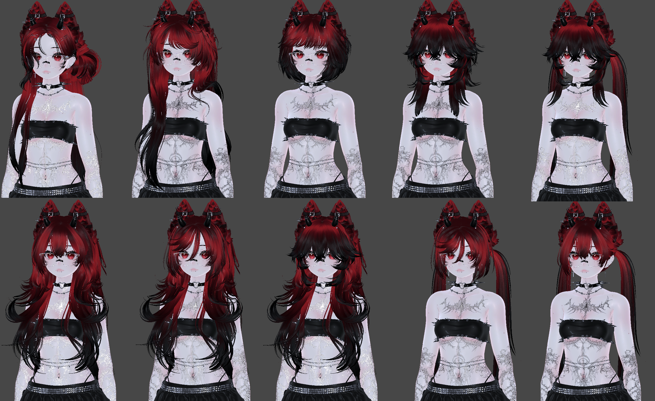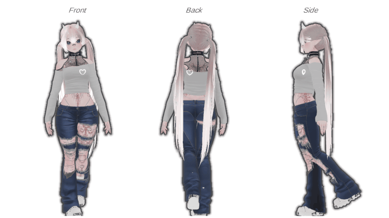 body, head, body textures, jeans, skirt (avary), short, crop hoodie, hoodie, hairs, hair wolf cut, glasses, sock, tank top, top, garter, leg straps, boots, sneakers, cat tail, tail fluff, harness (arcade), fishnet, barbedwire, belt choker, heart, arm belts, arm warmer, shirt, horns, tatto, VRCQuestTools, gogo loco, belly chain